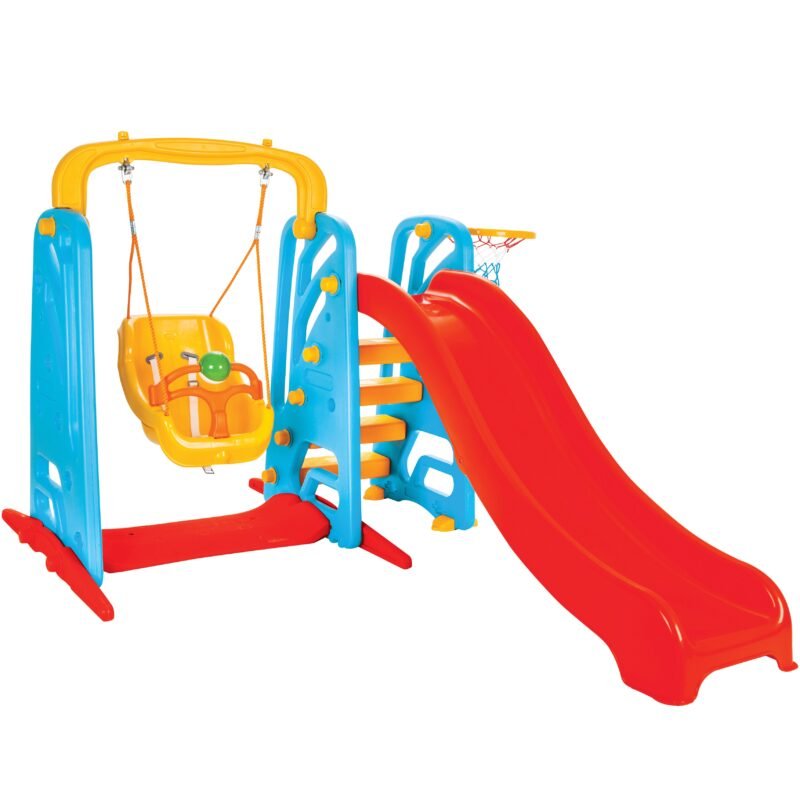 Plac Zabaw 3w1 marki Woopie jest doskonałym połączeniem dla najmłodszych! Plac posiada kolorową huśtawkę z zabezpieczeniem. Zjeżdżalnia posiada bezpieczne szerokie schodki i uchwyty do wejścia oraz dość stromy falisty zjazd o długości ślizgu 155 cm. Uzupełnieniem placu jest dołączony z boku placu kosz do koszykówki, który utrzyma dziecko w aktywności, co pomoże w rozwoju zdolności motorycznych dziecka. Dolną część placu można wypełnić piaskiem. Produkt jest łatwy do złożenia oraz idealny do użytku na zewnątrz oraz doskonały do zabawy w domu!