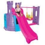 Plac Zabaw Zamek jest ogromną twierdzą do zabawy dla Twojego dziecka i jego przyjaciół! Plac zbudowany jest z wieży ze zjeżdżalnią oraz huśtawki typu swing. Wieża posiada liczne okna i otwory, przez które wpada dużo światła. Dodatkowo można z niej wyjść przez boczne drzwi i za pomocą schodków z trwałymi poręczami wejść na górę wieży i zjechać ze zjeżdżalni o długości ślizgu 166 cm. Wieża posiada wysokie boczne zabezpieczenia chroniące dziecko podczas korzystania ze zjeżdżalni, która ma długi, dość stromy śliz w pełni zadowalający każde dziecko. Cudowny plac uzupełnia miejsce z huśtawką typy swing, którą można ustawić na trzy sposoby zależnie od wieku i potrzeb (maksymalne obciążenie 50 kg). Wykonany jest z wysokiej jakości tworzywa sztucznego zabezpieczonego przed promieniowaniem UV – idealny do użytku na zewnątrz oraz doskonały do zabawy w domu!