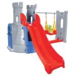 Plac Zabaw Zamek jest ogromną twierdzą do zabawy dla Twojego dziecka i jego przyjaciół! Plac zbudowany jest z wieży ze zjeżdżalnią oraz huśtawki typu swing. Wieża posiada liczne okna i otwory, przez które wpada dużo światła. Dodatkowo można z niej wyjść przez boczne drzwi i za pomocą schodków z trwałymi poręczami wejść na górę wieży i zjechać ze zjeżdżalni o długości ślizgu 166 cm. Wieża posiada wysokie boczne zabezpieczenia chroniące dziecko podczas korzystania ze zjeżdżalni, która ma długi, dość stromy śliz w pełni zadowalający każde dziecko. Cudowny plac uzupełnia miejsce z huśtawką typy swing, którą można ustawić na trzy sposoby zależnie od wieku i potrzeb (maksymalne obciążenie 50 kg). Wykonany jest z wysokiej jakości tworzywa sztucznego zabezpieczonego przed promieniowaniem UV – idealny do użytku na zewnątrz oraz doskonały do zabawy w domu!