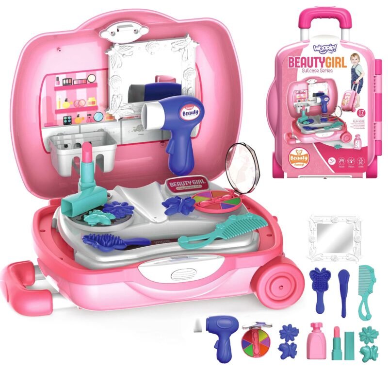 Przenośna Toaletka dla Dziewczynki w walizce od marki WOOPIE pozwoli Twojemu dziecku poczuć się jak modelka wszędzie i kiedy tylko zechce. Dzieci marzą o zostaniu modelką lub uwielbiają eksperymentować ze stylem. Zestaw zawiera 17 elementów: wszystkie potrzebne rzeczy, które posiada wspaniała toaletka. Zabawka pełni funkcję walizki, co pozwoli zabrać zestaw wszędzie. Odgrywanie ról i naśladowanie zawodów rozwija świadomość Twojego dziecka oraz pobudza wyobraźnie i kreatywność.