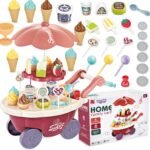 Wózek z Lodami marki Woopie będzie idealna zabawką dla Twojego maluszka i jego przyjaciół – nie tylko w upalne dni! Zabawka zapewnia kreatywną zabawę, odgrywanie ról, rozwija wyobraźnie i inne zdolności do prawidłowego rozwoju dziecka. Zabawa w “sprzedawcę” i “kupującego” pomoże rozwinąć świadomość i zdolności społeczne. Posiada wiele akcesoriów z najwyższej jakości dodatkami/naklejkami do zabawy/”sprzedaży” ze szczegółowymi modelami rożków do lodów, patyczków do lodów, lizaków lodowych, słodkich lizaków z rysunkowymi twarzami oraz innymi elementami, jak kanapki, pudełka na słodycze i przekąski, pucharki na lody, pudełko popcornów i butelka na sok. Dodatkowo niezbędnymi elementami zestawu są monety, które zachęcą dzieci do nauki podstawowych umiejętności matematycznych i finansowych podczas dokonywania zakupów. Oprócz bogatych dodatków posiada liczne specjalne funkcje: dźwiękowe (melodie włączane za pomocą guzika na blacie wózka), świetlne (kolorowy świecący trzon parasolki), w pełni obracająca się o 360 stopni parasolkę z półką, a samo stoisko po złożeniu parasolki i akcesoriów może przechowywać elementy wewnątrz wózka.
