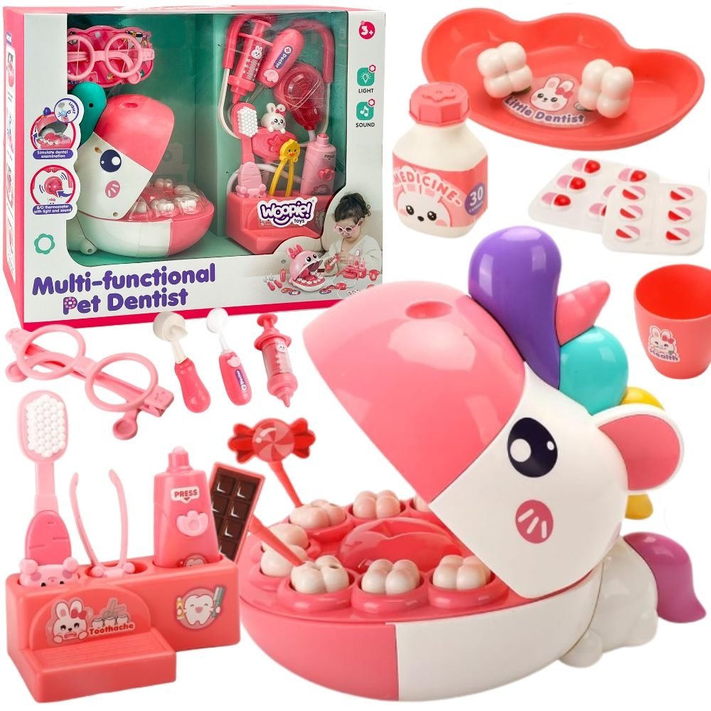 Zestaw małego dentysty głowa jednorożca to wyjątkowa zabawka edukacyjna, która wprowadza dzieci w świat medycyny i dbania o zdrowie jamy ustnej w sposób pełen radości i fantazji Dzięki temu zestawowi maluch może wcielić się w rolę małego dentysty, przeprowadzać badania, leczyć ząbki pacjenta i uczyć się podstaw higieny w zabawny oraz bezpieczny sposób. Realistyczny kształt zębów i przyjazny wygląd kolorowego jednorożca sprawiają, że dziecko z zaciekawieniem odkrywa każdy element zabawy. Otwierana paszcza z zestawem zębów pozwala na symulację prawdziwego badania dentystycznego – maluch może zaglądać do środka, używać narzędzi i przeprowadzać „leczenie”. W zestawie znajduje się wszystko, co potrzebne do małej kliniki dentystycznej: lusterko, szczypce, strzykawka, szczoteczka do zębów, a także stetoskop z efektami świetlnymi i dźwiękowymi. Dziecko może wcielać się w rolę lekarza, pacjenta lub asystenta – dzięki czemu zabawa staje się dynamiczna, angażująca i pełna emocji. Zestaw został zaprojektowany tak, aby nie tylko bawić, ale i uczyć. Dziecko poznaje budowę jamy ustnej, dowiaduje się, dlaczego mycie zębów jest tak ważne, oraz jak unikać próchnicy. Zabawka pomaga także w oswojeniu lęku przed wizytą u dentysty, dzięki czemu późniejsze spotkania z prawdziwym lekarzem przebiegają spokojniej. Wszystkie elementy zostały wykonane z trwałych, bezpiecznych dla dzieci materiałów o gładkich, zaokrąglonych krawędziach. Całość utrzymana jest w estetycznej pastelowej kolorystyce, która przyciąga wzrok i zachęca do zabawy. Zestaw jest bogaty w detale i pozwala dziecku poczuć się jak prawdziwy dentysta. Wszystkie elementy są lekkie, łatwe do uchwycenia przez małe rączki i starannie dopasowane do wieku dziecka. Świetnie sprawdzi się zarówno w domu, jak i w przedszkolu jako pomoc edukacyjna.