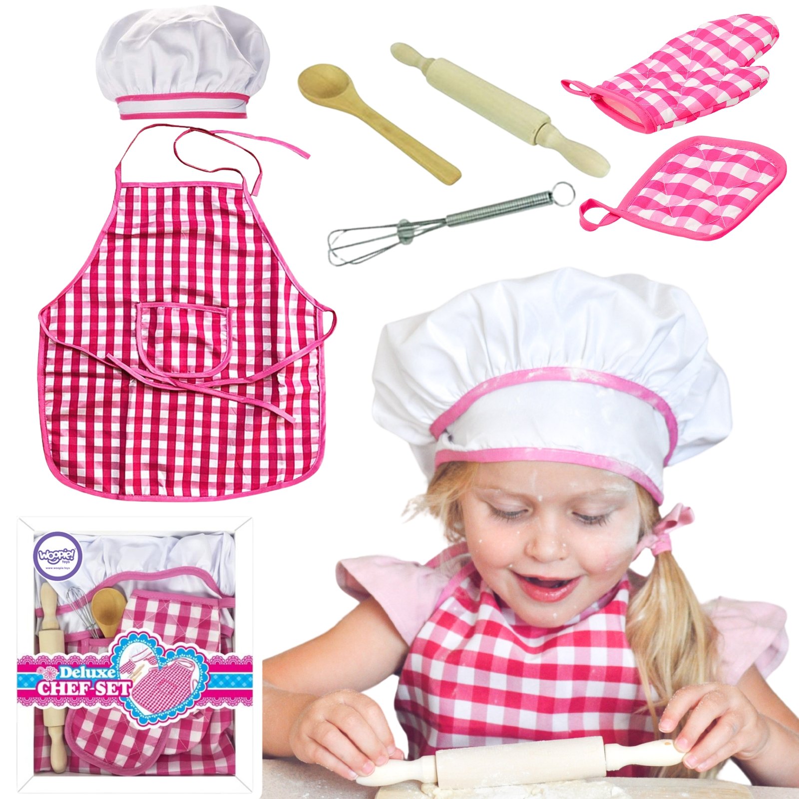 WOOPIE Zestaw Kucharza Strój Kucharski z Akcesoriami to idealny produkt dla każdego małego szefa kuchni. Ślicznie zapakowany świetnie sprawdzi się jako prezent dla małego kucharza. W skład zestawu wchodzi: fartuszek, czapka, rękawica kuchenna, podkładka materiałowa, wałek do ciasta o długości około 20 cm, drewniana łyżka oraz metalowa ubijaczka. Każdy maluch lubi pomagać w pracach kuchennych, dzięki temu zestawowi zostanie idealnie wyposażony w niezbędne akcesoria!