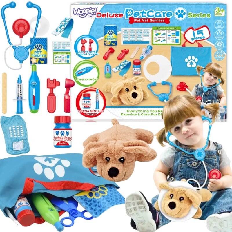 Zestaw Małego Weterynarza od marki WOOPIE to idealna propozycja dla wszystkich miłośników zwierzęta i zabawy w weterynarza. Zestaw zawiera 15 el., w tym: pluszaka/pieska, stetoskop, leki, strzykawkę, kołnierz i wiele innych. Zestaw pozwoli wyleczyć ulubionego zwierzaka, a przy tym dziecko będzie uczyło się empatii i nabywało umiejętności społecznych. Opieka nad zwierzętami to także nauka odpowiedzialności. Dziecko będzie mogło zabrać i bawić się swoim pupilem wszędzie, dzięki przenośnej torbie z wygodną rączką. Zabawka w weterynarza – odgrywanie ról – pozytywnie wpływa na rozwój dziecka, pobudza wyobraźnie oraz kreatywność.